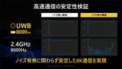 UWB対応により、使用する帯域は前世代までの2.4GHzから7.25~9.3GHz帯へと移動。これにより、従来機で多く用いられている2.4GHz帯での干渉を避けつつ、環境の影響を受けにくい安定した通信が可能になるという。一方で通信可能な距離は1.5mとやや短めだ。