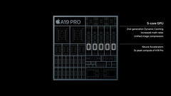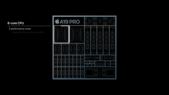 プロセッサには「A19 Pro」を採用。6コアのCPUとなっており、うち2基は高性能コア、4基は高効率コアとなっている。GPUは5コアで、それぞれのコアにニューラルアクセラレータを内蔵し、従来の3倍のピーク性能を実現するという。