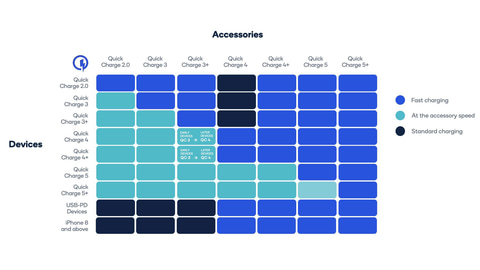 低発熱となったことで、高い電力を安定して出力可能となっただけでなく、デバイスのバッテリへの負担も軽減できるとする。加えて、低電圧化によりアクセサリのコストも抑えられるという。そのほか、Quick Charge 2.0/3.0/3.0+/4.0/4.0+/5との下位互換性も確保している。