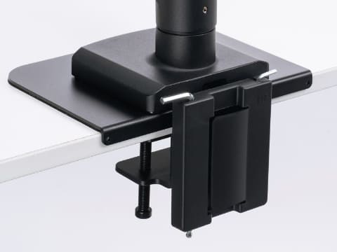 設置可能な厚みはクランプ式が15~70mm、グロメット式が20~85mm。デスク面を保護する補強プレートが付属している。