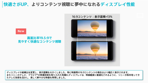 Xperia 10 VIIは、従来モデルからディスプレイとカメラの仕様を変更。ディスプレイは、フルHD+表示対応の6.1型有機ELで、アスペクト比が従来の21:9から19.5:9に変更。映画などの16:9のコンテンツを従来より広く表示できるとともに、ソニーのTV「ブラビア」の映像技術を取り入れることで、映画鑑賞に最適化した美しく鮮やかな映像を表示する。また、リフレッシュレートは最大120Hzに強化された。