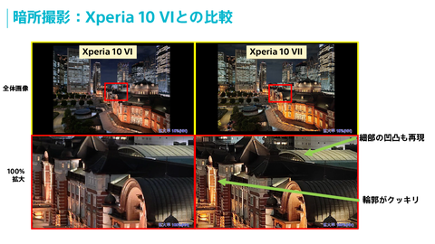 同時に、カメラの仕様も強化されている。24mm広角カメラの撮像素子は1/1.56型5,000万画素「Exmor RS for mobile」、16mm超広角カメラの撮像素子は1/3型1,300万画素と、いずれも従来より大型化・高精細化。特に広角カメラの撮像素子はサイズが約1.6倍となったことで、より多くの光を取り込めるようになり、低照度での撮影性能が向上。加えて、複数フレームの画像を重ね合わせ処理することでノイズを抑え、細部までくっきりとした高画質撮影を可能としている。なお、撮像素子の高精細化により、写真の記録はすべて1,200万画素(3,000×4,000ドット)となる。