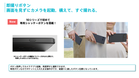 また、本体側面にXperia 10シリーズ初となる専用シャッターボタン「即撮りボタン」を搭載。Xperia 1シリーズのシャッターボタンのように半押しやAFロックはできないが、シャッターボタン長押しでカメラアプリが起動し、再度押すと撮影、というように簡単に写真撮影が行なえる。