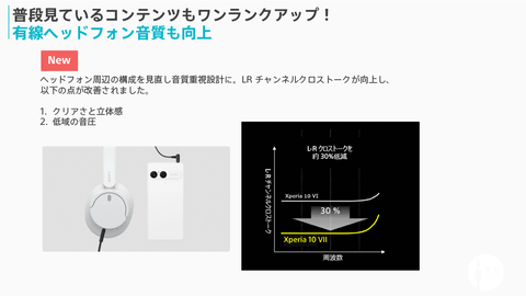 3.5mmオーディオジャックは音質重視の設計に見直すことで、L-Rチャンネルクロストークを約30%低減。有線ヘッドフォン利用時の音のクリアさや立体感、低域の音圧も向上している。