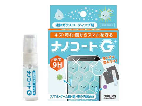ナノコートGは、スマートフォンのディスプレイに塗布することで、保護する液体ガラスコーティング剤。塗るとナノ粒子による保護膜が形成され、傷や汚れなどからディスプレイを守ることができる。撥水効果も持っている。