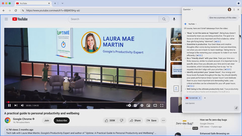 また、Gemini in Chromeの追加機能として、エージェント機能を今後数カ月中に実装予定。散髪の予約や食料品の注文など、ユーザーが実行したいタスクを指示すると、GeminiがWebページを操作して処理してくれる。さらに、複数のタブの情報を集約してくれる機能、「先週見たウォルナットデスクのWebサイトは?」といったプロンプトで過去に閲覧したWebサイトを自然な言葉で探せる機能、YouTubeなどGoogleアプリとの連携機能なども加わる。