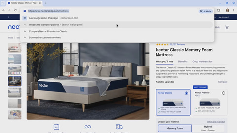 AIを使った高度な検索機能「AIモード」にもアドレスバーから直接アクセスできるようになる。今月後半に米国の英語環境向けに順次提供し、数週間かけてより多くの地域と言語に拡大予定。アドレスバー関連では、表示中のWebページの内容に応じて質問を提案する機能を米国英語版向けに提供中。こちらは今後数週間中に展開地域/言語を拡大する見込み。