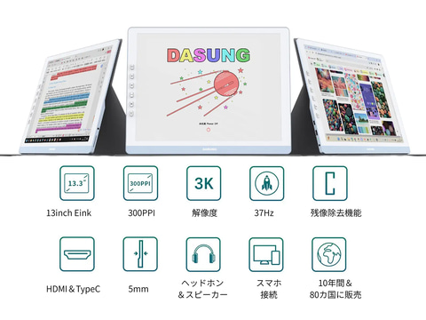 DASUNG13KC/DASUNG13Kシリーズは、電子ペーパーの弱点であった表示速度を大幅に改善することで、DC電源接続により37Hzの高速リフレッシュレートに対応した、PCモニターとして使える電子ペーパー。新搭載の「M1 Webモード」により、マウス操作時に発生しがちな残像(コメットテール)を軽減し、ちらつきのない安定した表示を実現したという。また、電子ペーパー特有のゴースト(残像)を軽減する技術や、最薄部5mmの筐体なども特徴。
