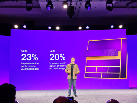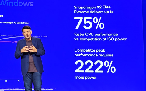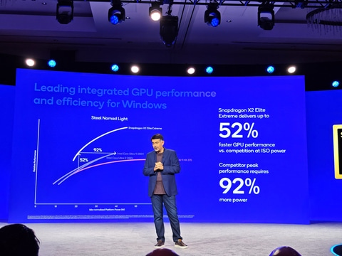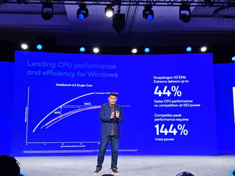 今回のコンダップ氏の基調講演で注目を集めたのは、競合他社との性能比較だ。Snapdragon X2 Elite ExtremeとRyzen AI HX 370との比較では、同じ消費電力での性能は44%高く、Ryzen AI HX 370で同じ性能を実現するには144%多くの電力を必要とすると説明された。
