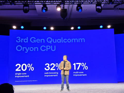 カトージアン氏は「我々は昨年に独自設計の第2世代Oryon CPUを搭載した製品を投入した。そして今年はさらにOryonを第3世代に強化したSnapdragon 8 Elite Gen 5を発表する。第3世代Oryonは、新しいモバイル向けCPUの性能を定義するCPUとなる。プライムコアCPUは4.6GHzにブースト可能で、CPUクラスタごとに12MBのL2キャッシュを持っているなどの特徴を備えている。それにより、Geekbenchのシングルスレッドで20%、マルチスレッドで17%、さらにはWebブラウジングのベンチマークで32%の性能向上を実現する」と述べ、性能向上を強調した。