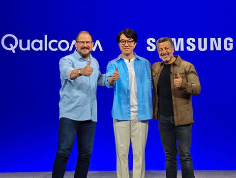今年の末までに累計で4億台のGalaxy AIに対応したデバイスが市場に投入される見通しだという。その後、QualcommのCEOであるクリスチアーノ・アーモン氏もステージに上がり、カトージアン氏、チョイ氏の3名で記念撮影が行なわれた。