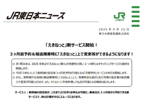 東日本旅客鉄道(JR東日本)は9月25日、ネット予約サービス「えきねっと」に新サービスとして「早期予約」および運休・遅延列車の新規購入/無手数料での払い戻しを開始すると発表した。運休・遅延列車の新規購入は10月2日から、早期予約と払い戻しは10月31日からそれぞれ始まる予定。