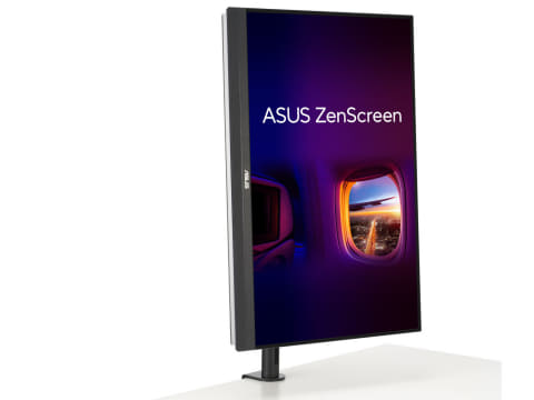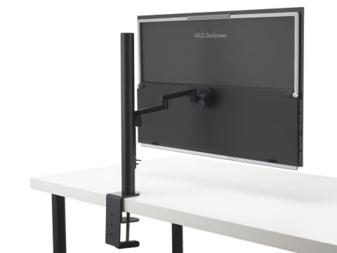 ZenScreen MB27ACFは、最大70Wでの給電が可能なUSB Type-C接続のモバイルモニター。WQHD(2,560×1,440ドット)の非光沢IPSパネルを採用しており、デスク固定設置用のC型クランプ式アームやパーティションフック、キックスタンド兼用のキャリーハンドルなどを同梱している。USB Type-Cケーブル1本での動作も可能なほか、大画面ながら本体のみの厚さが29mm、重量が2.98kgと持ち運びも可能なデザインとなっている。