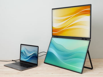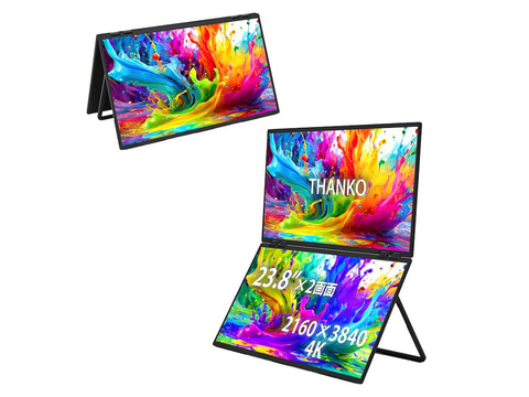 本製品は、23.8型の4K(3,840×2,160ドット)非光沢液晶パネルを2枚搭載した折りたたみ式のデュアルモニター。キックスタンドを備えており、上下または左右2画面の環境を構築できる。USB Type-Cケーブル1本で接続可能なほか、HDMIやDisplayPortでの接続もできる。