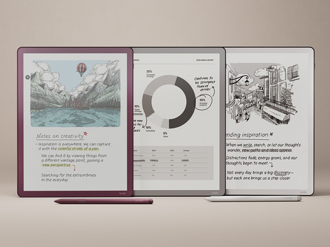 また、カラー表示対応モデルがラインナップに加わった点も大きなポイント。独自開発のColorsoftディスプレイ技術や新開発のレンダリングエンジンなどを組み合わせており、電子書籍のカラー表示だけでなく、10色のペンや5色のマーカーによるノートブックへの書き込みにも対応する。一方、数週間のバッテリ駆動時間も実現した。