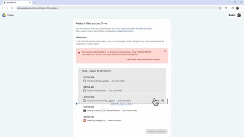 新機能を有効にすると、Googleドライブ内でランサムウェアを検出した場合に該当ファイルのクラウド同期を自動で停止し、アラートを表示する。Googleドライブ上のUIから過去バージョンのファイルを選択することで、ファイルの復元が行なえる。