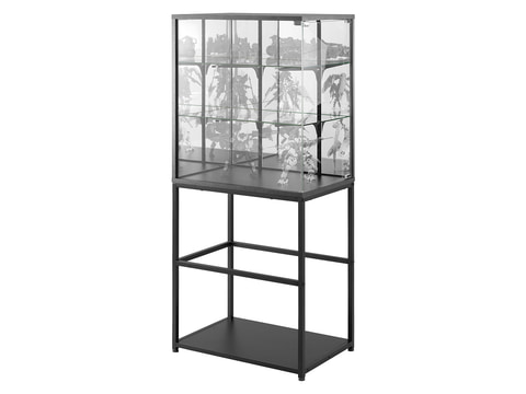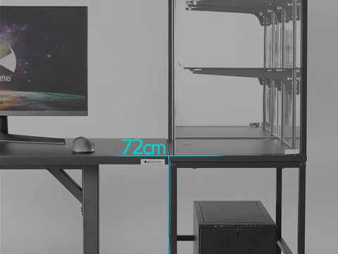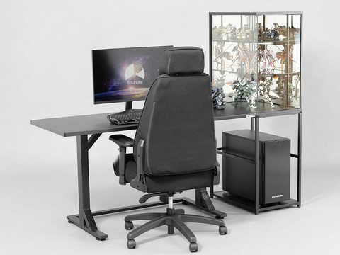 デスクサイドフィギュアラックは、本体下部にPC収納スペース、上部に強化ガラスを使ったフィギュア棚を備えたラック。フィギュア棚は底面を地上高72cmの位置に設定しており、一般的なデスクと高さが合う設計とした。高さ66cmまでの大型フィギュアも飾ることができ、2.5cm単位で高さを変えられる棚板も装備。奥側にはL字型ミラーも配置している。