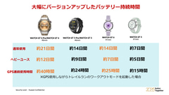 HUAWEI WATCH GT 6シリーズはスポーツでの利用を念頭に開発されたスマートウォッチで、2018年初代モデルの投入から数えて第6世代となる。新たにハイシリコンバッテリを採用し、容量が65%増加。46mmモデルでは、通常使用において約21日間、ヘビーユースでも約12日間、GPS連続使用で40時間駆動できる。41mmモデルも従来から延びており、それぞれ約14日間、7日間、25時間駆動できる。
