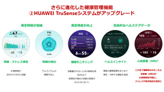 ヘルスケア回りでは、新たに心電図計測機能を搭載。この機能は日本のプログラム医療機器の承認を取得済みとなっている。また、情緒・ストレス計測機能では、計測時間の短縮とアルゴリズムの向上、情緒の12段階表示が可能となった。このほか、睡眠モニタリング測定精度の向上、心拍変動の常時測定可能化(従来は睡眠時のみ)などが挙げられる。