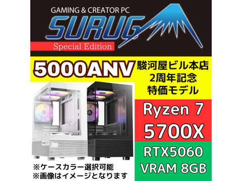 駿河屋は、Ryzen 7 5700XとGeForce RTX 5060(8GB)を搭載したゲーミングPC「SURUGA 5000ANV」を10月15日までの期間限定で発売した。受注生産品で価格は12万4,800円。