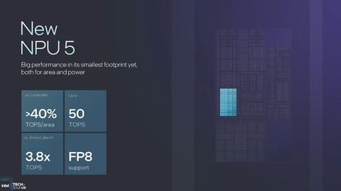 NPUは同社が第5世代NPUと呼ぶNPUへと強化されている。内蔵演算器(MAC)こそ1万2,000基とLunar Lake(第4世代NPU)のそれと同じだが、内部構造を見直すことで、ダイ面積あたりの性能は40%改善されており、より少ない消費電力でLunar LakeのNPUをやや上回る50TOPSの性能を発揮できる。
