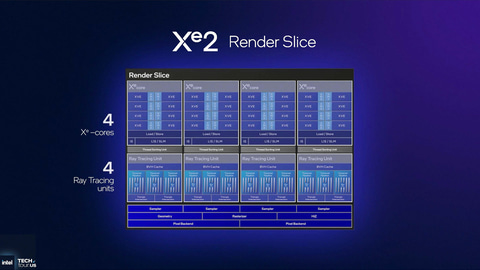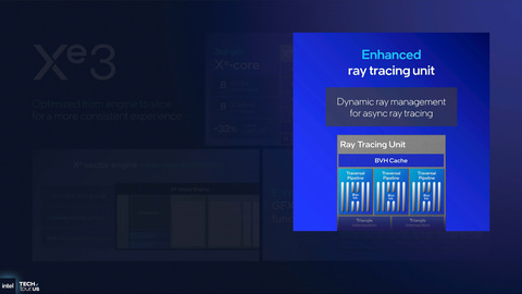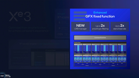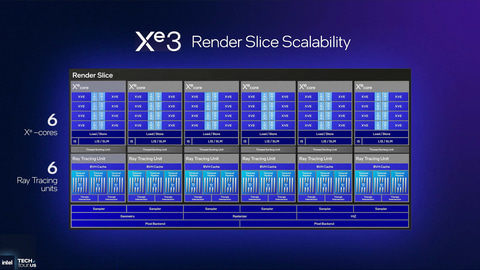 そのXe2の次の世代として用意されたのが今回のPanther Lakeで採用されているXe3となる。従来のXe2では、1つのレンダースライス(IntelではGPUを階層的に構築しているが、レンダースライス単位で増減したりすることが可能)に内蔵されているXeコアは最大4つになっていた。それに対して、Xe3ではそれが最大6つに増やされている。今回のXe3では最大構成として2レンダースライスの構成が用意されており、XeコアはGPU全体で最大12と、Lunar Lakeの最大8から強化されている。