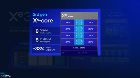 ただし、内部の演算器そのものの構造は、基本的にXe2世代と同じだ。具体的にはXe2で導入された512bitのベクターエンジンが8つある形になっており、内部ではSIMD16をネイティブでサポートするFP(浮動小数点)のALUとINT8(整数)のALU、XMXエンジンが1つ内蔵されているなどの構造は共通だ。