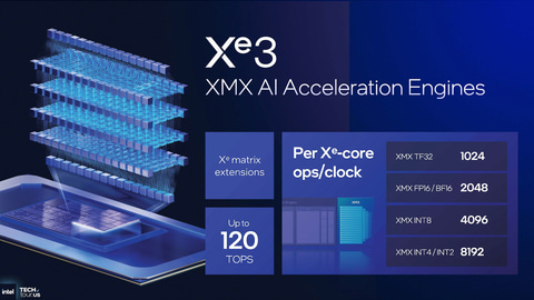 Xeコア数が最大で12コアになったことに伴い、XMXのユニット数も増えている。具体的にはLunar LakeのXe2の64に比べて96に増加しており、それに合わせてINT8を利用した場合のAI推論性能は120TOPSへと高速化されている。サポートされる精度はXe2と同じTF32、FP16/BF16、INT8、INT4、INT2となる。