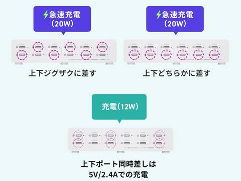 主な仕様は、単ポート使用時は最大20W、「上段もしくは下段どちらか1列のみ」か「上下交互に」6ポートを使用した場合は1ポートあたり最大20Wで合計120W、「全12ポート」か「上下に並んで2ポート」を使う場合は、1ポートあたり最大12Wで合計最大144W。