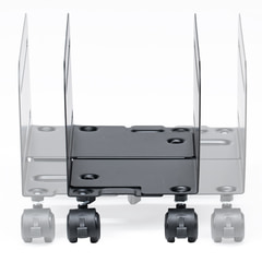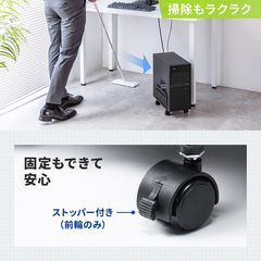 キャスター付きで、重いPCを載せた場合でも簡単に移動させられる。また前輪にはストッパーを備えており、不意な移動の心配もない。