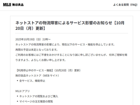 良品計画は10月20日、同社が展開する無印良品のオンラインショップ「無印良品ネットストア」の受注および出荷業務を19日21時より停止していると発表した。