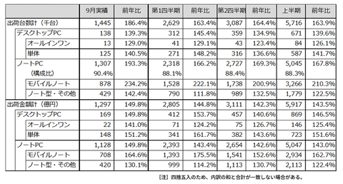 一方、デスクトップPCは、前年同期比39.6%増の67万1,000台。そのうち、オールインワンが同26.1%増の8万4,000台、単体が41.7%増の58万7,000台となった。