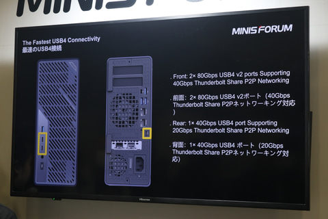 このカードを抜きにしても、1基の10Gigabit Ethernet、そして1基の2.5Gigabit Ethernetポートを装備。後者はvProに対応し、BIOSレベルからリモートからの管理が可能となっている。さらに、80Gbps転送が可能なUSB4 Version 2.0ポートを前面に2基、40Gbps転送が可能なUSB4ポートを背面に1基備えている。実質Thunderbolt 5と4になっており、ケーブル1本でP2Pネットワークが構築できる。