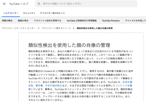 類似性検出機能は、著作権保護機能「Content ID」と同様の仕組みを使って人物の類似性を検出する機能。検出する顔の参照映像を設定すると、その人物の顔が使われている可能性のあるフェイクコンテンツを検索/検出して表示できる。該当する動画が見つかった場合は、プライバシー侵害の申し立て手続きに沿ってコンテンツの削除を求めることができる。