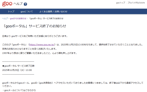「gooポータル」が11月25日で終了。28年の歴史に幕