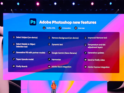 そのAIの説明が終わった後、通常のAdobe MAXではメインコンテンツとなっているCreative Cloudのデスクトップアプリの説明を行なった。今回Adobeは、Adobe MAXの開幕日にCreative Cloudのバージョンアップを実施し、Photoshop、Illustrator、Lightroom(クラウドおよびClassic)のバージョンアップを行ない、新機能の実装などを行なっている。