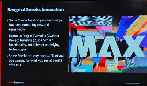 その一方で、SneaksはAdobeの未来を示すセッションとなっている。このSneaksに参加するのはAdobeの研究所(Adobe Research)に所属している研究者で、実際に普段研究している研究成果を発表する場としてSneaksが用意されているのだ。