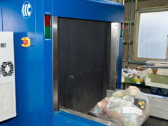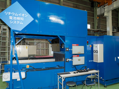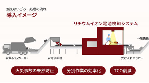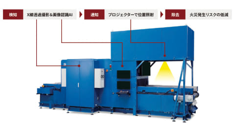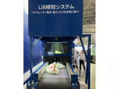 同日、IHI検査計測がコンベアとX線検査装置からなる「LiB検知システム」を発表しており、このシステムがRaptor VISION BATTERYを採用した最初の製品となる。LiB検知システムでは、投入したゴミ袋を水平/垂直の2方向から撮影し、袋の内部にリチウムイオン電池を検知するとアラート音を発する。コンベア出口にはモニターとプロジェクタを設置し、リチウムイオン電池の検知箇所をプロジェクションマッピングで赤枠強調表示することで、すばやく除去しやすくなっている。飛行場の手荷物検査場のようなイメージだ。システムの価格帯は、X線撮影方向が1方向のシステムで6,000万円から。X線撮影方向が水平/垂直の両方に対応すると6,500万円から。