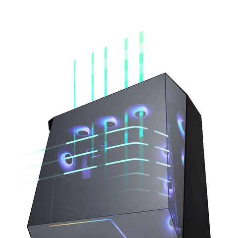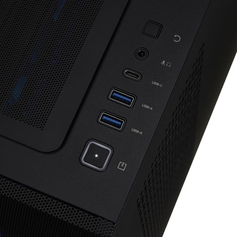 筐体は10基のケースファンとメッシュ構造の通気口を備え、エアフローを確保。天面にはUSB 3.2 Gen 1 2基、USB Type-C、音声入出力などとマグネット式ダストフィルタを装備。底面にはスライド式ダストフィルタを備える。