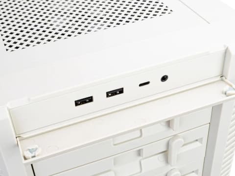 正面上部にUSB Type-C、USB 3.0 2基、音声入出力を装備。ケース上面と底面にはダストフィルタを備えている。