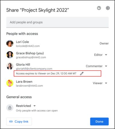 新しい動作では、編集権限の期限が切れると、親フォルダに設定されている権限(この場合は閲覧者)が与えられ、ファイルへのアクセス権を完全に失うことはなくなる。この変更により、共有ドライブの動作と一貫性が保たれる。