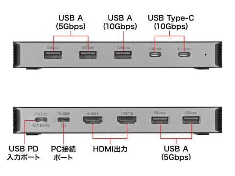 USB-CVDK21は、HDMI 2基、USB 3.2 Gen 2 Type-C 2基、USB 3.2 Gen 2 1基、USB 2.0 4基を備えたドッキングステーション。別途設けられた電源入力専用のType-Cポートは最大100W入力が可能で、PC接続用のポートは最大85Wの給電に対応。HDMIは2系統までの4K/60Hz映像出力が行なえる。本体底部には両端に滑り止めのシートを備えた。