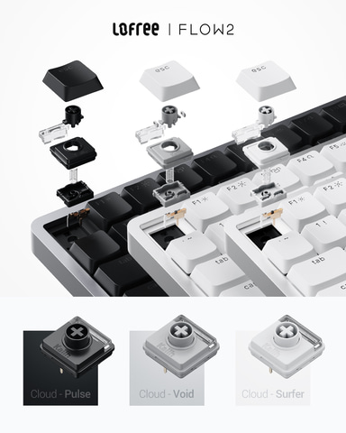 キースイッチは、ユーザー調査に基づき開発した「Cloudシリーズスイッチ」を搭載。高精度設計により打鍵感の滑らかさを約12%向上させたほか、12点接点構造による安定性強化、ライトホール拡大によるバックライト透過性向上を実現したという。シルバーモデルには「Surfer(リニア)」および「Void(静音リニア)」、スペースグレーモデルには「Pulse(タクタイル)」をそれぞれ搭載する。