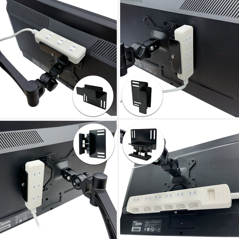 モニター用電源タップホルダー VESA式は、モニター裏に電源タップを固定できるVESAマウント対応ホルダー。VESAマウントは75×75mmと100×100mmをサポートする。モニターアームとの併用も可能だ。