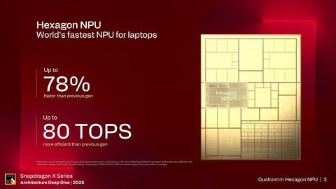 本レポートではSnapdragon Architecture Deep Dive 2025のセッションの中で明らかにされた、ノートPC向けSoCの中では現状トップとなる80TOPSの性能を実現しているNPU、そしてそれ以外のSoCの詳細などに関して紹介していく。