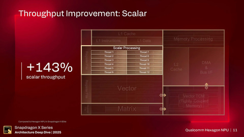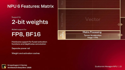 NPU6はスカラーエンジンが12基、ベクターエンジンが8基となっているほか、2bitウェイトの行列演算器が実装されているなど、基本的にはSnapdragon 8 Elite Gen 5に搭載されているHexagon NPUと同様のスペックになっている。Qualcommは明確にはしていないが、Snapdragon 8 Elite Gen 5にも同じNPU6が搭載されていると考えてよいだろう。ただし、クロック周波数などはPC向けとは異なっている可能性があるので、PC向けと同じ性能を発揮するかは分からない。