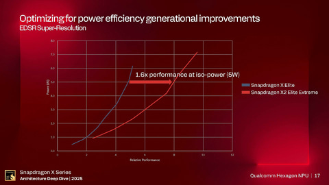 Snapdragon X2シリーズのNPUは、Qualcommが「NPU6」と呼んでいる、第6世代のSnapdragon用NPU(Hexagon NPU)が採用されている。Qualcommは、どの世代がどの製品に搭載されているかを明白にしていないが、Snapdragon XシリーズはNPU3だったと今回明らかにした。Snapdragon X2シリーズに搭載されたNPUはそこから3世代分新しくなったということになる。