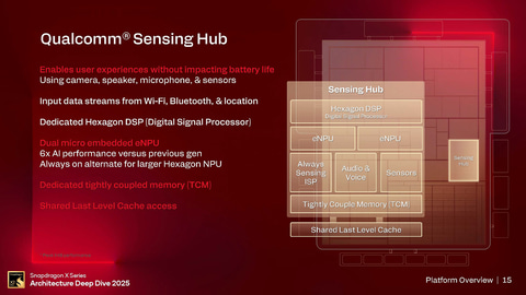 また、今回のSnapdragon X2シリーズでは、通常のNPUに加えて、Qualcomm Sensing Hubという低消費電力の小型NPUも実装されている。前シリーズには搭載されておらず、新シリーズの大きな強化点の1つとなる。Sensing Hubは、SoCの中でも低消費電力アイランドに置かれており、Windowsがモダンスタンバイになっていて、CPUやGPUといった電力食いのプロセッサが停止している状態でも動作し続けている。