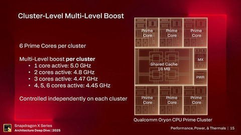 QualcommのSnapdragon X2シリーズにも、そうしたブーストクロック周波数が用意されている。たとえば、Snapdragon X2 Elite Extreme(X2E-96-100)の場合、プライムコアCPUの動作クロックは1つのCPUクラスタ(6コア)あたりシングルコア時が5GHz、デュアルコア時は4.8GHz、3コア時は4.7GHz、4~6コアが4.45GHzに設定されている。Snapdragon X2 Elite ExtremeにはプライムコアのCPUクラスタが2つあるため、SoC全体ではシングルコアでも、デュアルコアでも5GHzで動作させられる。