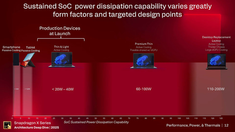 ただし、Snapdragon X2 Eliteは、TDPが20~40W程度のいわゆる薄型ノートPCをターゲットにした製品で、ディスクリートGPU(dGPU)が入っている60~100W、よりハイエンドのdGPUが入っている110~200Wといった、より高TDPのワークステーションPCやゲーミングPCはターゲットにしていない。
